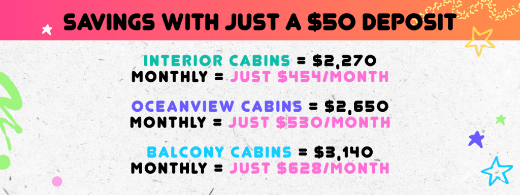 - Book any cabin for only $50 down per person!